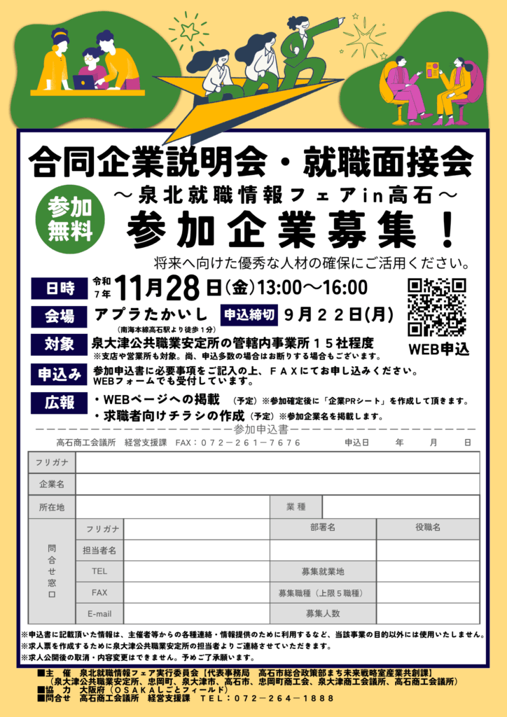 お知らせ 【受付終了】合同企業説明会・就職面接会~泉北就職情報フェアin高石~ 参加企業募集! 2025.09.01 WEB申込はこちら 高石市HPはこちら 即戦力を探している事業所の採用担当の方は、ぜひご参加ください。 詳細は、高石市ホームページをご確認ください。