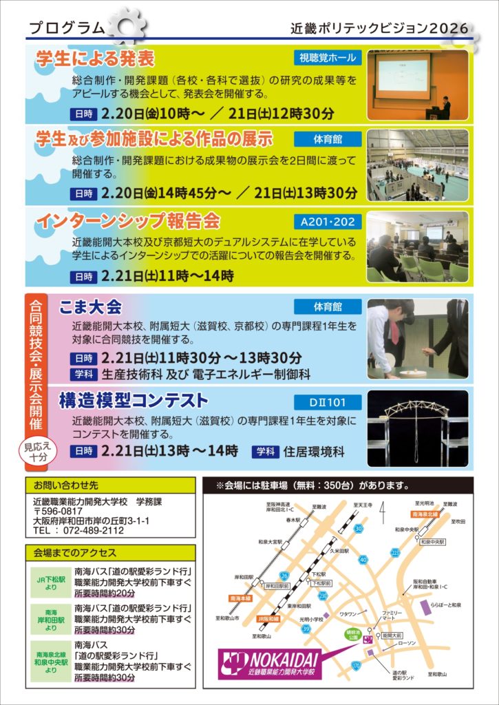 イベント 近畿ポリテックビジョン2026(2/20-21) 2026.01.29 近畿ポリテックビジョンでは、近畿ブロックの職業能力開発大学校における教育訓練の成果を発表、展示などを通じて地域の皆様に発信します。学生が段階的、体系的に取得した活動の成果をご確認ください。